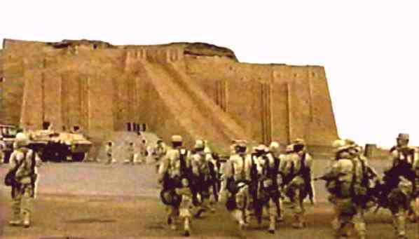 U.S. troops (2003) visit the Ziggurat of Ur of the Chaldees – the birthplace of Abraham. This is a reconstruction of the once derelict ziggurat, and was rebuilt by Saddam Hussein. The remains of the old ziggurat are still visible at the top of the structure. Construction is not completed yet. Notice the similarity between this ziggurat and the Altar of God. |