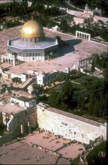 The Wailing Wall (foreground) and the Dome of the Rock (top). |
