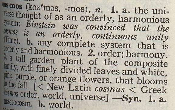 Kosmos or Cosmos . It’s prime meaning is ‘universe’. Einstein however, related it to time. This will really add to the confusion of the feeble-minded. |