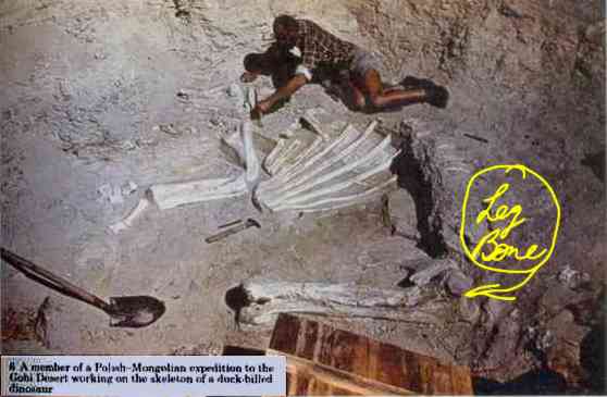 Fossilized Dinosaur. In the Gobi desert an archeologists chips away at the stone to extract the remains of a giant dinosaur. Note the upper leg-bone in the foreground. It’s the size of a man. |