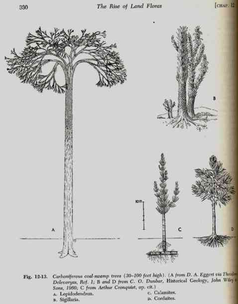 Prehistoric flora . An artist’s attempt to recreate a plethora of extinct plants in a swamp-like setting. All of these represent species found in coal-bedded fossilized flora. They may well have existed in swamps, but the end product which was produced in coal was not produced in this setting. |
