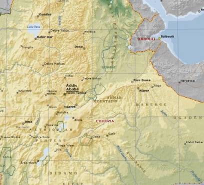 Map of Ethiopia.  It shows the Great Rift which divides the country, and this rift is filled with rivers.