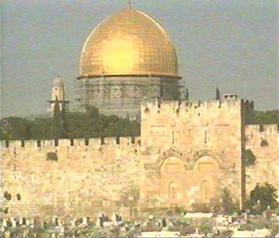Yet another view that exhibits the atrocious conduct of the Moslems.  Not only have they blocked the King’s Gate to prevent entry and desecrated the hillside with their graves, they have also build this Mosque over the Most Holy Place.