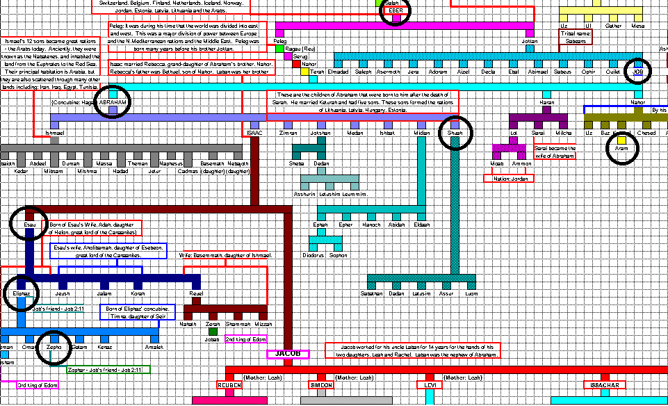 An excerpt from 'Genealogy of the Bible' by Neville V. Stevens. The circles on the graph denote the principle people connected to Job's genealogy. Click on the image for an enlargement. You will notice that both Abraham and Job sprung from the line of Eber, from where the name Hebrews is derived. During the time of Ebers two sons (Peleg and Joktan) the earth was divided into east and west (Gen 10:25). Job (Jobab) was the last born son of Joktan, and became the greatest of all the MEN OF THE EAST. The recorded linage of Joktan ends abruptly with Job. Following the death of all Jobs sons and daughters it may have been the end of his line except for the grace of God. But we learn that God gave Job an additional 140 years of life as well as great wealth and seven sons and three daughters (Job 42:12-16). The sons arent named in the Bible, but the daughters are, and their names are Jemimah, Keziah and Keren-Happuch (V14). Everything recorded in the Bible is there for a purpose! These daughters started a line of wild olive trees that will have significance in the endtime.