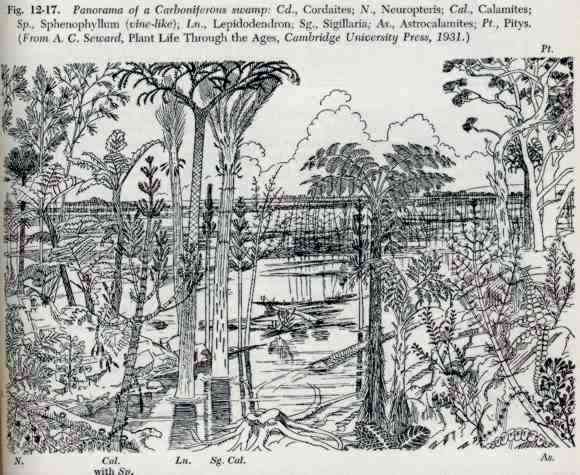 Prehistoric flora . An artist’s attempt to recreate a plethora of extinct plants in a swamp-like setting. All of these represent species found in coal-bedded fossilized flora. They may well have existed in swamps, but the end product which was produced in coal was not produced in this setting. |